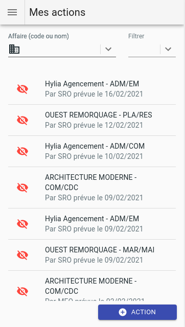 Il permet à l’utilisateur de consulter et filtrer rapidement et facilement sa liste d’actions non traitées. Il permet aussi d'accéder à tout moment aux informations du client et à la liste des interlocuteurs qui y sont associés.