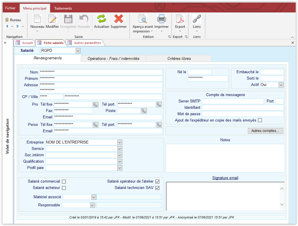 Dans le logiciel HERAKLES, l’anonymisation consiste à supprimer les données personnelles dans le but de rendre les fiches non identifiables. Ces actions sont tracées sur les fiches avec la date du traitement et le code de l’utilisateur l’ayant lancé. Cette anonymisation peut être lancée à la demande à partir des sélections de clients, fournisseurs, interlocuteurs et salariés.