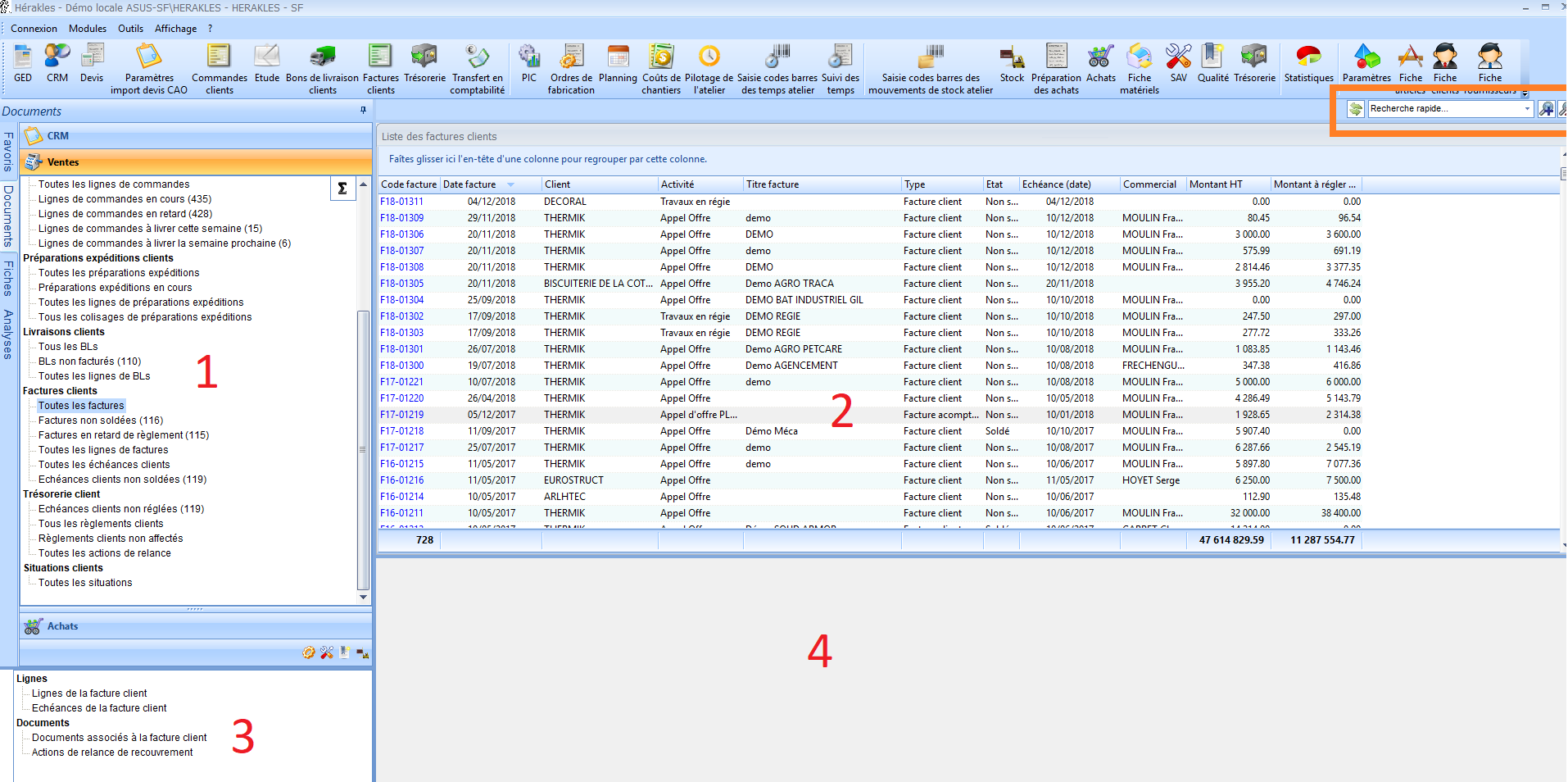 - Les zones 3 et 4 permettent d'accéder au détail des factures : lignes de la factures, documents associés.